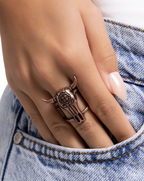 Centered along airy copper bands, a copper cow skull featuring a free-spirited pattern atop its forehead glistens from the finger for a whimsically wild look. Features a stretchy band for a flexible fit.